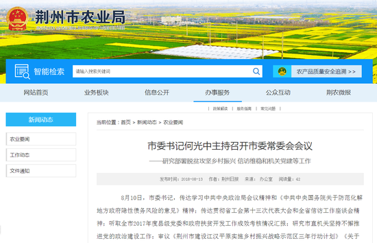 8月10日,市委书记,传达学习中共中央政治局会议精神和《中共中央国务院关于防范化解地方政府隐性债务风险的意见》精神;传达贯彻省工会第十三次代表大会和全省信访工作座谈会精神;听取全市2017年度县级党委和政府扶贫开发工作成效考核情况汇报;研究市直机关坚持不懈推进党的政治建设工作;审议《荆州市建设江汉平原实施乡村振兴战略示范区三年行动计划》《关于进一步加强信访法治化建设的实施细则》等市委文件。